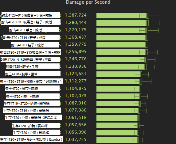 对于生存猎人,目前看7.25最好的橙装匹配是护腕+赛咪咪或者日地裤,尽管赛咪咪不会触发,但伤害依旧是所有橙装中仅次于护腕的。这个情况很好的说明了生存尴尬的境地,核心橙装毫无核心可言,仅在某些场合适用。4T20的表现也很勉强,以至于作者仍然要把削弱过的4T19列入评估。此外,个人对于列表中最后Exodia的配置毫无头绪,如果有人知道还请告知。