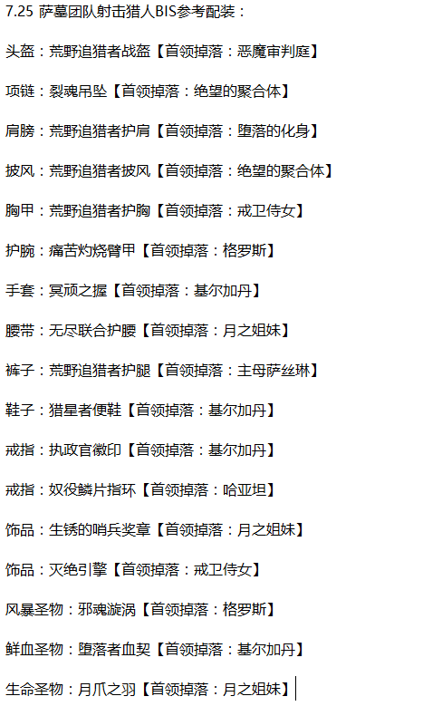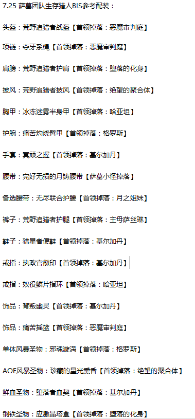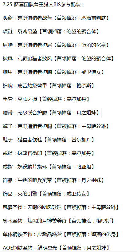 触发暴击的苏拉玛吸毒套在7.25版本中仍然有一定的优势(如果你没打算使用4T20+2T19配装或者T20肩膀[主精通副全能属性]装等不够高),而且,新的橙装戒指将会是射击猎人的单体必备橙装,它对灵巧流提供了巨大的增益,目前在测试环境下,戒指的表现非常抢眼,单体和AOE都有提升,尤其是单体数据,超过手套,实际表现由于稳定瞄准buff的机制可能会有差异。目前攻略作者认为射击4T20+高装等吸毒套应该是萨墓开放后最强的套装匹配。2T19虽然依然可用,但仅适合那些喜欢无限制缩短百发百中CD的射击猎人,这种混合套装在秘境中依然有用,但是否适合新团队尚待考察。