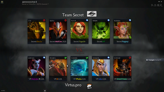 首场比赛VP保持了他们全英雄挑战赛,Puppey酱自然不买账,各种BAN掉VP没用过的强势英雄。最后双方阵容如下所示: