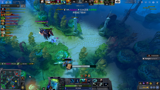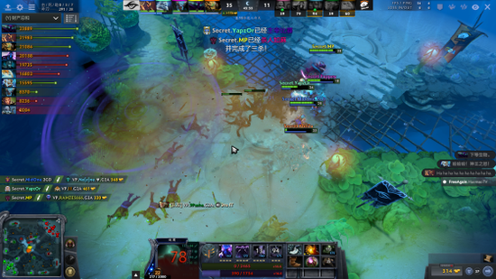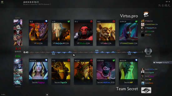不知为何战术大师Puppey酱为何还能让VP仅剩不多的英雄中拿出戴泽哈斯卡组合,外加上毒龙这两大线霸英雄VP中上两路线上优势无限大。小黑阵容线上劣势,反而被VP打起推进节奏,Secret只能通过VP冲塔强送才能收获人头。
