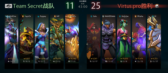 这局Secret终于开始注重中路Midone的发育,下路瘟疫法师单对线斧王也是毫无压力,双核无解发育辅助完美游走节奏,Secret在前期压制住了VP。Solo这个5号位的大熊猫打了10多分钟仅比初始经济多了100快。15分钟圣堂刺客跳刀暗灭在手,带盾直逼VP中路高地,这一波正好是9Pasha斧王跳刀第一波,跳吼直接秒杀瘟疫法师,随后击杀圣堂两命。然并卵,VP前期给自己挖的坑实在太大,在Secret的猛攻之下20分钟中路高地告破。22分钟VP又是亡命一波流,团灭之后秒敲GG,VP看来为他们上一局入场败人品付出了代价。