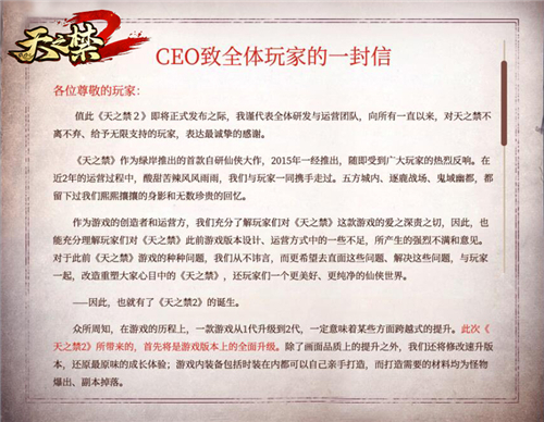 从天之禁到《天之禁2》,不仅是游戏版本与品质的全面提升,更是绿岸网络为所有仙侠网游爱好者带来的一场真正绿色、公平公正的“游戏宣言”。游戏官方将竭尽全力,为玩家营造出更加纯净、绿色的游戏环境,公司CEO许帆更是为全体玩家奉上一封饱含灼灼真情的公开信,对给予天之禁无限支持的玩家们表达了最诚挚的谢意同时,保证绝不容忍任何涉嫌违反游戏公平的行为,坚决捍卫玩家的权益,绝不姑息!