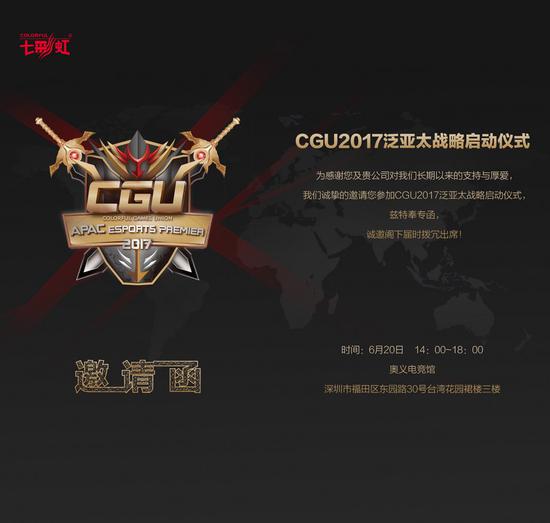 CGU2017泛亚太电子竞技大赛2017年,CGU更进一步,泛亚太顶级民间电竞赛事火爆来袭!CGU2017泛亚太电子竞技大赛(CGU APAC 2017)是由七彩虹独立策划、运营的面向亚太地区最广大电竞爱好者的洲际民间电竞大赛。赛事服务中国、韩国、印度尼西亚、菲律宾、越南、泰国、香港等亚太多个国家和地区的电子竞技爱好者,帮助他们实现自己最闪耀的电竞明星梦想,携手打造出高标准、职业化、属于最广大普通爱好者的泛亚太顶级电竞舞台。