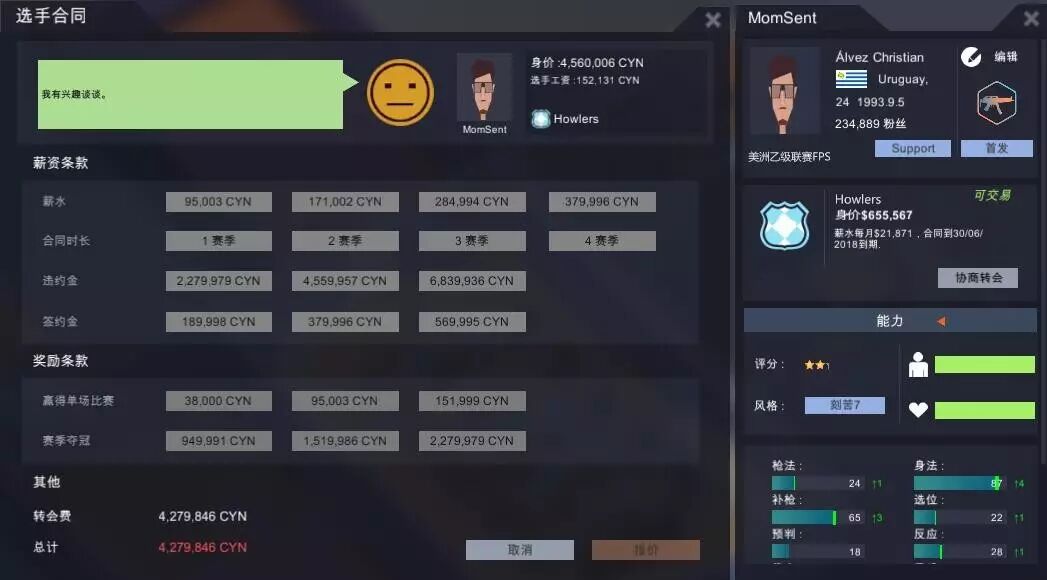俱乐部最初只有5名选手,你可以在联赛开始前的转会期选择想要的选手加盟你的俱乐部。选手市场将会提供每位选手的信息,其中包含能力、报价、粉丝数等,当你能提供合适的报价时,这位选手将会进入你的大名单中。