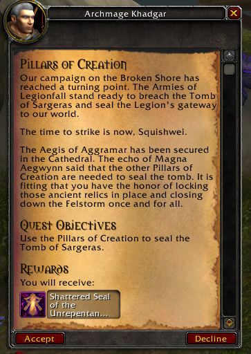 萨墓相关的破碎海滩任务,分别是用“创世之柱”封印萨格拉斯之墓和击杀基尔加丹,两个任务均奖励1500抗魔联军声望,前者多奖励一个神器能量。没有装备奖励!