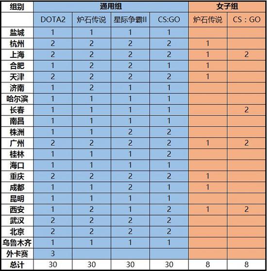 至此,WESG中国区预选赛将新包含北京、湖北及乌鲁木齐赛区在内的共20个赛区,预选赛出线名额如下: