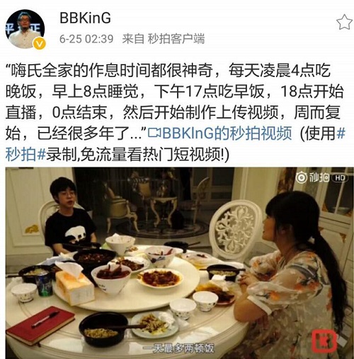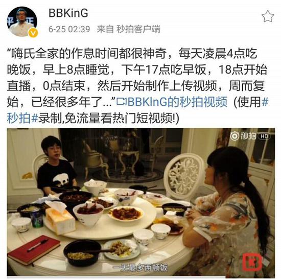从微博里也看出,嗨氏和嗨妈每天凌晨四点吃晚饭,早上八点睡觉,下午五点吃早饭,六点开始直播到十二点。直播结束后还要制作上传视频,周而复始,就为的是让晚上没看到直播的粉丝们能够一早起来便看到直播视频。而这样的循环,一下子就是七年。