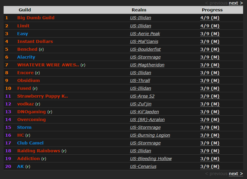 截至今天早上,美服的Big Dumb Guild公会以4M的进度暂列世界第一,而美服的Limit公会以同样的成绩(第二击杀M4)暂列世界第二。拿到了3M进度的公会已经超过20家。