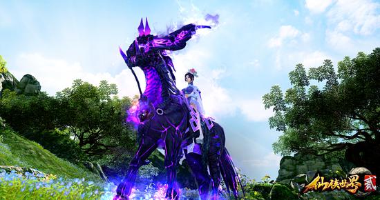 “紫电魔龙驹”是《仙侠世界2》中外形最酷炫的坐骑之一,是众多男性玩家的坐骑首选。该坐骑最拉风的在于起奔跑起来之后,地面会燃烧起来长长的紫色的灰烟,以迅雷不及掩耳之势呼啸而过。
