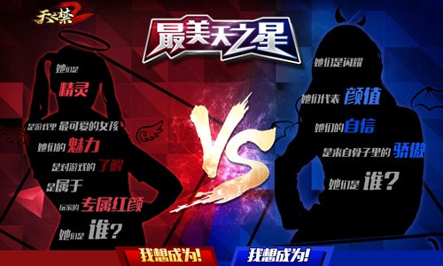 除了天之星回归外,这个红蓝两色的悬念页面上硕大的“VS”同样引人注目。或许在《天之禁2》“最美天之星”活动中,将会加入PK元素。想到这些有着长腿酥胸的美女们隔空争奇斗艳,甚至有可能上演“真人PK”的香艳戏码,着实令人期待。
