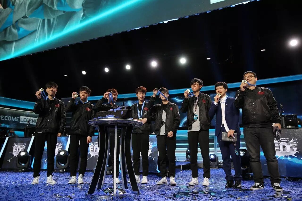 另一个是2015年的MSI季中邀请赛,EDG前中单选手U(上图右3)作为替补随队来到比赛现场,在没有出场一次的情况下获得了生涯第一个,也是唯一一个世界冠军。