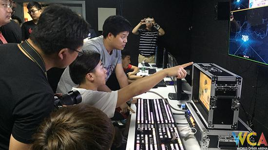 3、2、1,准备!开始!14:00整,一段激情的WCA世界电子竞技大赛开场音乐想起,WCA赛事平台《CS:GO》精英赛整点直播。平日里在终端看到的精彩电竞赛事画面到底是由谁?是怎样做出来的?走进WCA直播室,同学们终于见到了在幕后的“英雄“们。赛事直播中的操作流程,起步于电视媒体行业后电竞从业多年的李燕飞导师如数家珍,设备前的直播团队配合娴熟默契。
