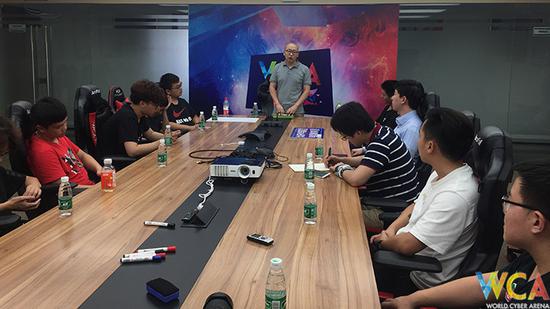 回到大会议室,WCA品牌宣传中心温宇龙老师和师生们进行交流。专业名词,五杀,OB的英文缩写由来,温宇龙老师从同学们熟知的话题引入,介绍了 WCA部门组成和职能,以及在电竞行业从业技不压身的感悟。