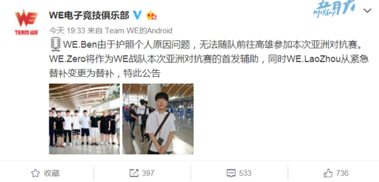 WE.Ben由于护照个人原因问题,无法随队前往高雄参加本次亚洲对抗赛。WE.Zero将作为WE战队本次亚洲对抗赛的首发辅助,同时WE.LaoZhou从紧急替补变更为替补,特此公告。