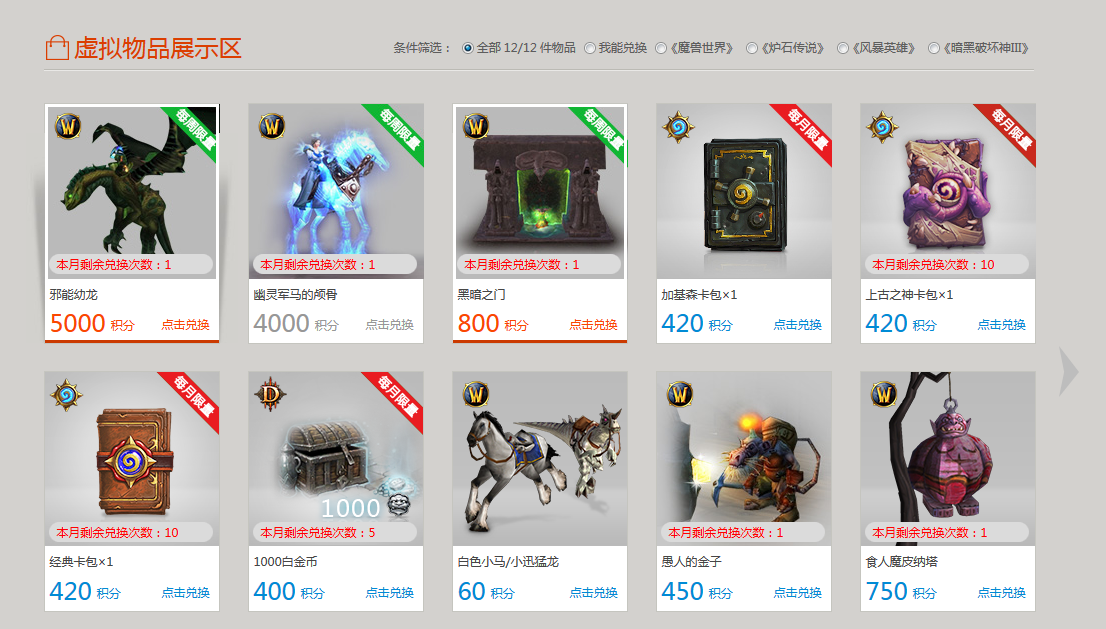 本月,战网积分物品兑换中心上新货了!可以用积分兑换邪能幼龙和幽灵军马的白骨这两种卡牌坐骑,还有一个黑暗之门的玩具。