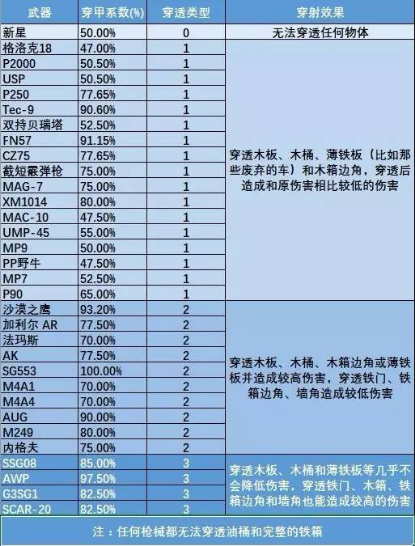 目前经过各地玩家们的测试,暂时将CS:GO中所有枪械的穿射能力分为4档。我在这里将他们分为:穿透类型0、穿透类型1、穿透类型2和穿透类型3,并分别对应不同枪械。
