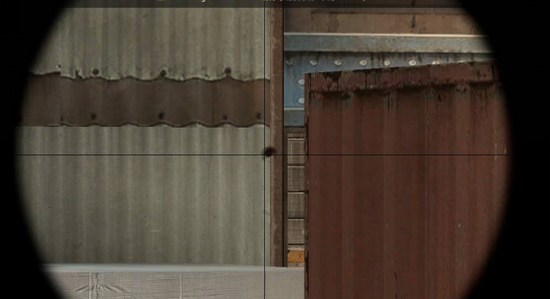 来到T中厅左后方的木箱上,将准星移到最底部,瞄准基线后保持下蹲状态。之后瞄准如图位置开火。因为CT在白箱位置可能站,可能蹲,上图的瞄准点穿射的是站立的敌人,因此穿射时也可以将准星适当下移,穿射下蹲的敌人。
