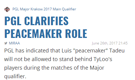 大概的意思就是在Major赛事进行时,peacemaker不允许对天禄进行实时指导,因为有其他参与该比赛的战队合约在身(尽管Misfits并没有晋级Major预选赛)。单从这个层面上来说,其作为教练的职能可以说是大打折扣,为此Peacemaker在今天还专门和Misfits解除了合约,来专心执教TYLOO战队。
