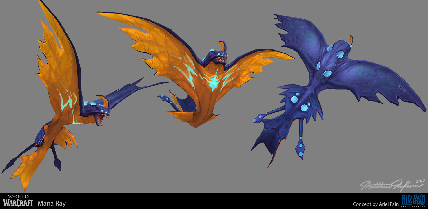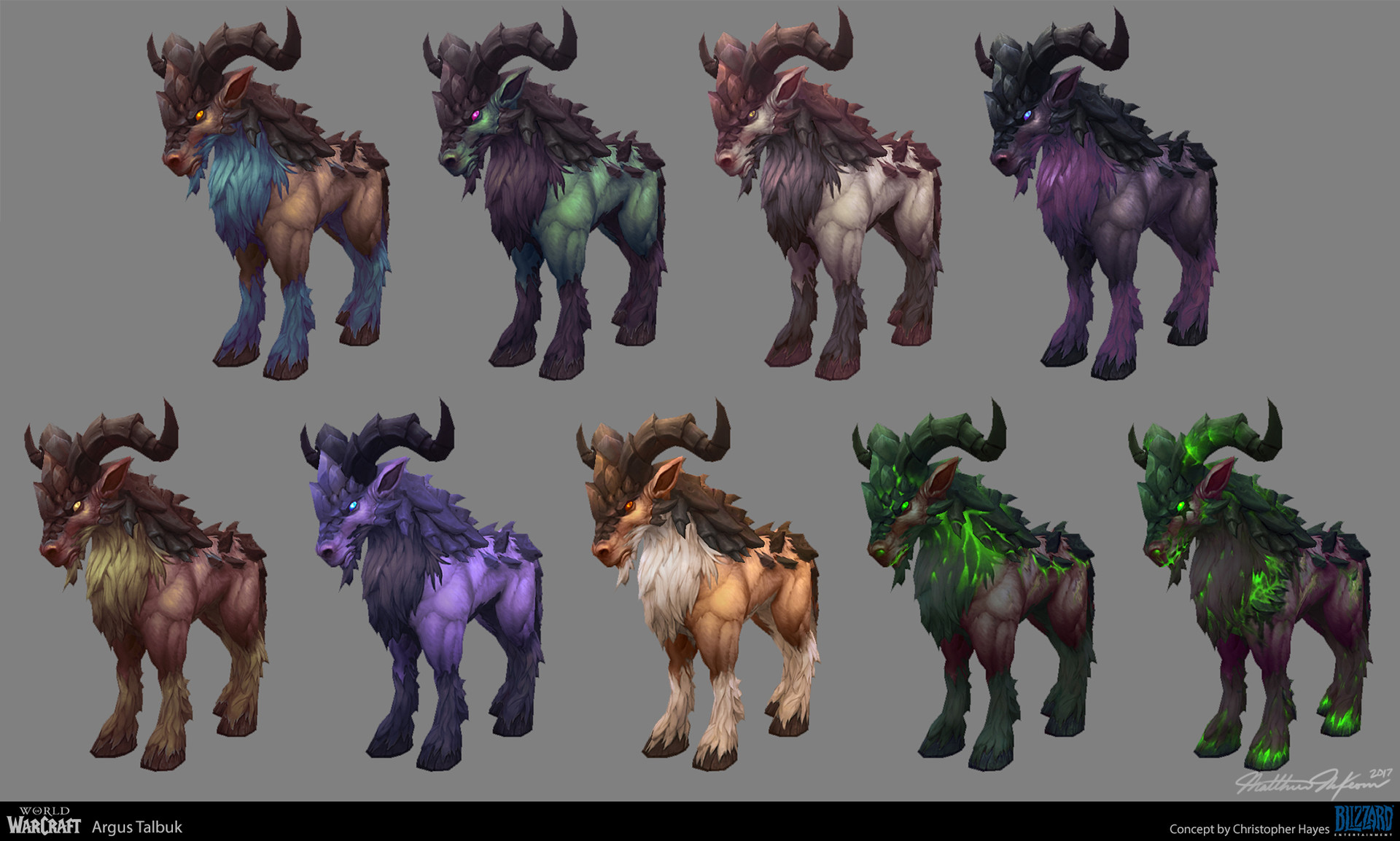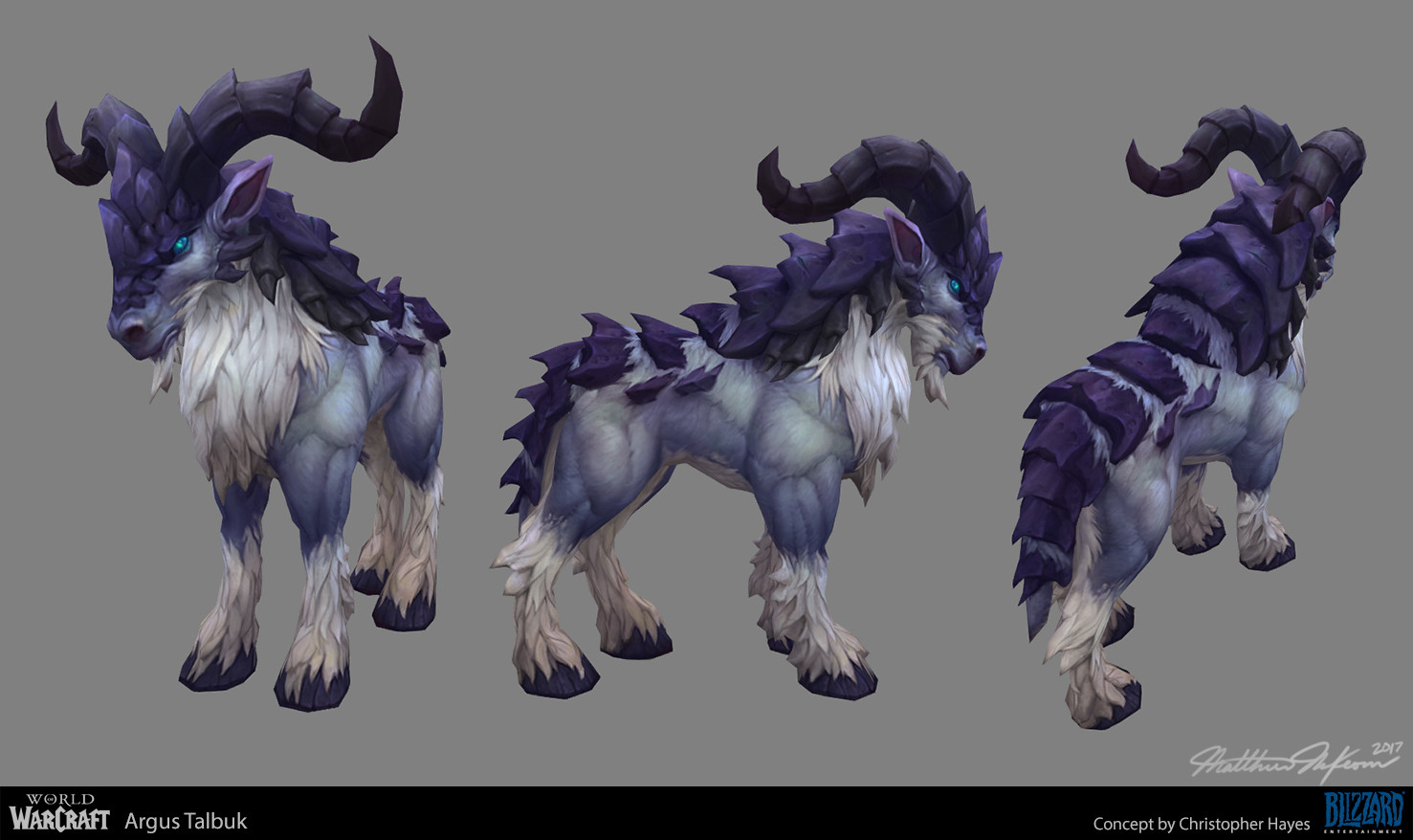 暴雪角色设计师Matthew McKeown所设计的一些7.3版本生物,阿古斯穴居人、法力鳐和塔布羊。