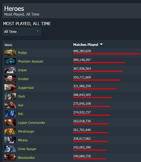那么屠夫帕吉到底有多受欢迎?在dotabuff有统计所有英雄被使用的局数。帕吉高居榜首,从DOTA2开始至今,已经有超过4.9亿局比赛出现过帕吉了,而排在第二位的亚军PA仅3.8亿局。排在末尾的则是天穹守望者,只出现了1600万局,最后一个登场的DOTA复刻英雄孽主只比天穹守望者好了那么一丢丢。而最晚出来的英雄——大圣,也登场了超过4300万次。