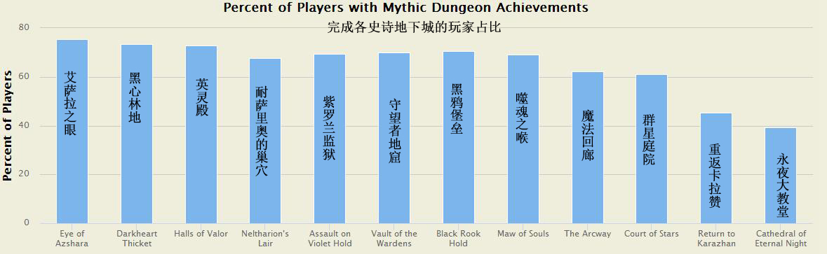 另外,在各史诗5人本的统计中,艾萨拉之眼是完成次数最多史诗5人本,而永夜大教堂和重返卡拉赞则是完成次数最少的两个史诗5人本。