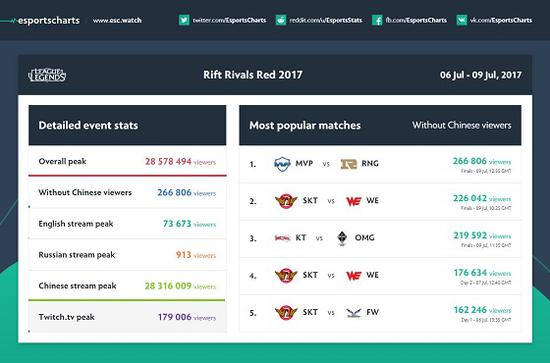 根据esportscharts的统计,亚洲对抗赛在线观众的峰值超过了2千8百万。而在减掉中国的收视数据后,在线观众峰值只有26万多。最大的直播平台Twitch上最多也只有接近18万人收看。