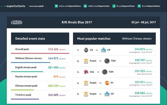 相比之下,欧美对抗赛的数据自然在外国有更好的收视率。G2和C9第一天的比赛吸引了超过34万的外国观众。从榜单上也可以看到,欧洲老牌战队Fnatic依旧是收视率的保障。