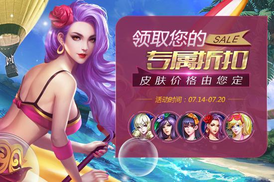 7月14日-7月20日,在热辣暑期来临之际,《英魂之刃》将全新推出泳装皮肤限时折扣活动!这一次,幻影之歌?潘多拉、碧波荡漾?小乔、仲夏清和?聂小倩、热夏战武?女武神四大英魂美女英雄泳装皮肤将以专属折扣的形式进行售卖!玩家将可以在游戏中领取专属于自己的皮肤折扣,你所倾心的女神英雄皮肤可能将以极低的价格轻松入手!此外,如果玩家成功解锁了以上四位美女英雄皮肤,更将免费领取炎夏月影?暗月猎手限定皮肤!现在,就为你钟爱的英雄换上性感清凉的泳装皮肤,在匹配对战中,享受其他玩家的艳羡目光吧!