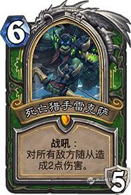 暴雪第三次尝试对猎人进行游戏性改革是KFT的猎人英雄橙。由于剩余卡牌尚未全面公布,我们无法得知其它猎人职业卡是否还有更进一步的联动;而单就英雄橙这一张牌来说,我是相当失望的。我不喜欢这张牌的原因是缺少构筑倾向:我可以直接把死骑雷克萨加入一套现成的中速猎卡组,于是我就有了打后期的能力。死骑雷克萨和大王还不一样,大王拍下去当回合对场面影响小,而且大王是9费,这意味着一套带大王的卡组必须要有足够的清场能力,以创造出一个适合变大王的时机。而死骑雷克萨自带战吼清场,这样一来泛用性提升了不少,恐怕会成为一张滥用单卡。虽然英雄技能确实增加了抉择量,但如此一来,带死骑雷克萨的卡组总体框架仍然是一套按费拍怪的中速猎。只要我没有抽到死骑雷克萨,我的游戏体验仍然是按费拍怪。这种方式的游戏性改良实在不算什么好方案。希望后续发布的更多单卡能带给我们更多控制猎的套件吧。