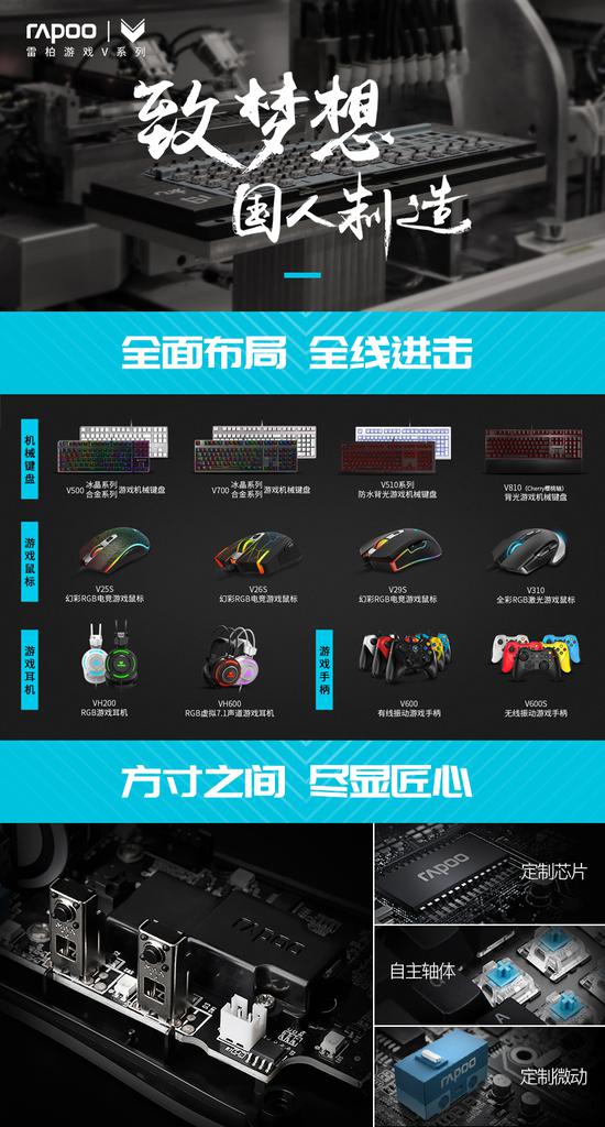 雷柏成立于2002年,从无线外设的行业领军品牌,到2008年进入专业游戏外设领域,推出广为畅销的雷柏游戏外设V系列。雷柏不断革新,升级核心技术,在2016年不仅引领“全民RGB风”的游戏外设行业方向,更打造出游戏鼠标、游戏机械键盘、游戏耳机、游戏手柄、游戏鼠标垫等全线电竞级的明星产品。