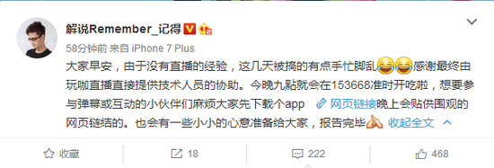 今早10点,LPL解说Remember_记得发微博称平台已定,由于没有在内地直播的经验,最终敲定在玩咖进行直播,听说直播中还有一些小小的心意准备给大家,传说中的粉丝福利?是LPL战队的队服还是周边,或者是本人的签名照?