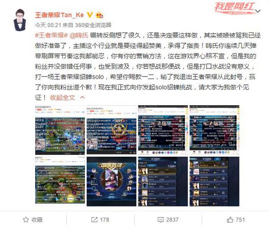 2017年7月20日在风起云涌的《王者荣耀》江湖上惊现了一场大事件!嗨氏水军肆意轰炸各大主播直播间这早已不是什么新鲜事,迫于其水军淫威之下,许多主播敢怒不敢言,但是今天00:21分国服第一貂蝉宋坦克(Tan_ke)终于发飙,微博上公告:以封号为注,挑战嗨氏1V1solo貂蝉,为被骂粉丝讨一个公道!
