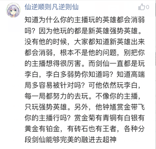 有嗨氏粉丝“嗨宝”在评论区指出:嗨氏已经说过自己是娱乐主播了,剑仙是技术型主播,打不过很正常。请注意“娱乐主播”这四个字,出自嗨氏自己之口。剑仙的第3个账号也正在朝全区第一前进,这是要把苹果手Q区、微信区,安卓手Q区、微信区都占领吗? 果然是要成为《王者荣耀》终极boss的趋势。