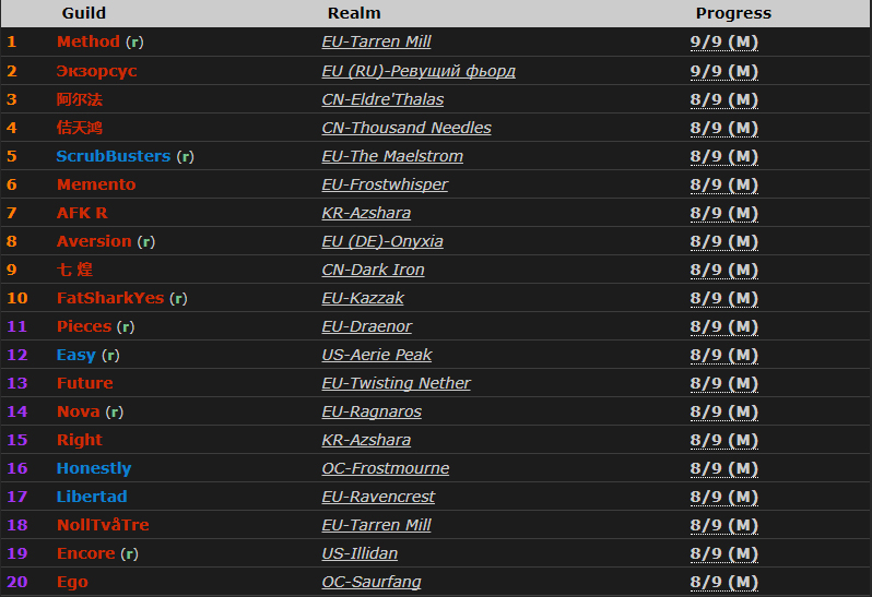 可以看出,Exorsus跟Method一样用了大量的战士和盗贼作为近战DPS组合,但远程上,Exorsus使用了3个法师(Method是3个猎人)。2个熊T跟1个术士也跟Method相似。