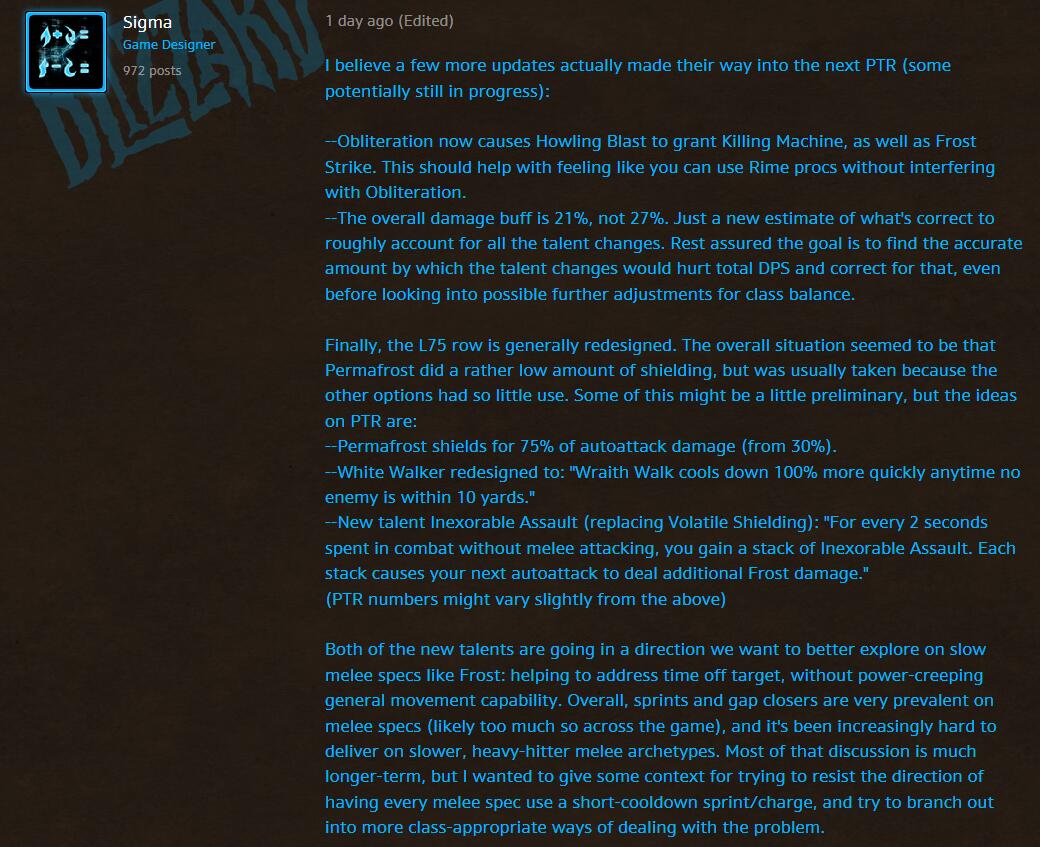 这些新天赋都指向了我们想更好探求慢速近战专精如冰爽死亡骑士的方向:帮助解决不攻击目标的时间,提高慢悠悠的移动速度。总的来说,加速和闪现靠近在近战专精中很是流行(可能在游戏里太多了),这让我们越来越难实现慢速,重击的近战模型。绝大多数关于此的讨论都是长期的,但是我希望给出一些内容,扭转给每个近战专精一个短CD的冲刺/冲锋类技能的方向,并试图用多种方式,用更适合该职业的方式来处理这个问题。