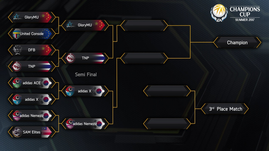 2017年EA冠军杯夏季赛于22日进行了8进4的较量,经过四场激战,中国黑马GloryMU战队,泰国TNP战队,有韩国三队之称的adidas X以及韩国一队adidas Nemeziz晋级四强,比较可惜的是经过三小局的鏖战中国的DFB战队仍然不敌对手遭到淘汰,GloryMU也成为了本次EA冠军杯中国队伍唯一的独苗。