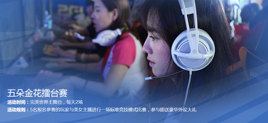 在完美世界的主舞台上,每天将举办“五朵金花水友擂台赛”,现场玩家将能报名与5名美女主播展开5V5的竞技对抗!获胜的玩家将能获得由CS:GO ChinaJoy战略合作伙伴罗技提供的键盘、鼠标、耳机等外设大礼,想不想叫上战友,与小姐姐们一较高下呢?