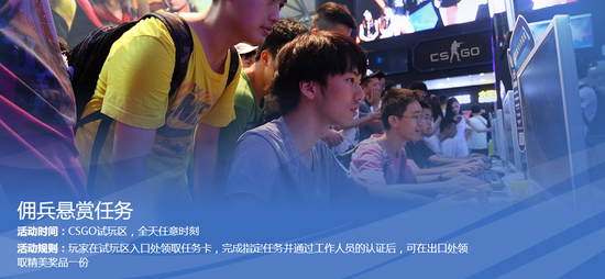 如果你是一名初入CS:GO的玩家,也许你对自己的枪法没那么自信,没关系!在CS:GO试玩区将全天候开放“佣兵悬赏任务”,所有玩家都能报名体验,跟现场工作人员领取“神秘任务”,在试玩区进行挑战。成功执行任务的玩家,将能获得精美的CS:GO贴纸一枚!