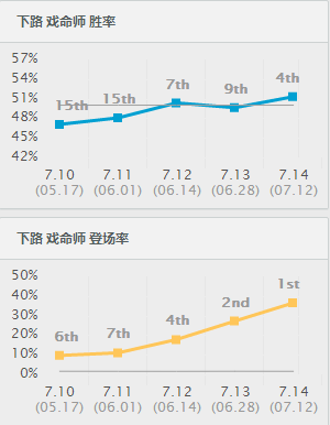 自从烬连续两个版本的加强,以及穿甲装备调整以来,烬终于再一次迎来了他的春天。透过上面的图我们可以非常清晰的看到这一点。而且7.14版本里烬在登场率登顶的情况下,胜率更是到达了第四位。可喜可贺!