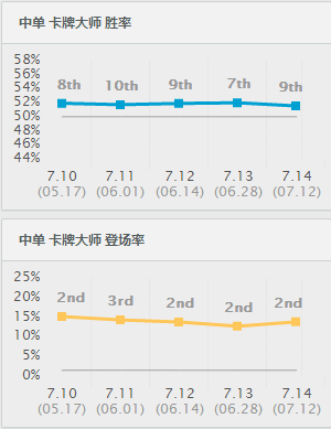 卡牌大师的使用率非常高,在竞争激烈的中路也从未掉出前三,而相比起来胜率就非常一般了,最佳情况也只有第7。但是这并不能说明卡牌就很一般,因为相比其他的中单英雄他已经好太多了。像是登场率最高的发条,即使风光无限她的胜率却不到50%,可见登场率对胜率的影响是相当大的。而卡牌在这种高登场率的情况下仍然能保持进52%的胜率,这已经可以说非常厉害了。