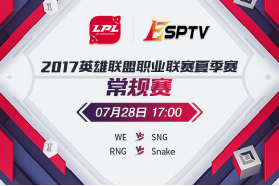 ESPTV电竞世界频道明日(7月28日)17:00将为您直播LPL夏季赛常规赛的比赛,由WE Vs SNG ,RNG Vs Snake,欢迎届时收看!