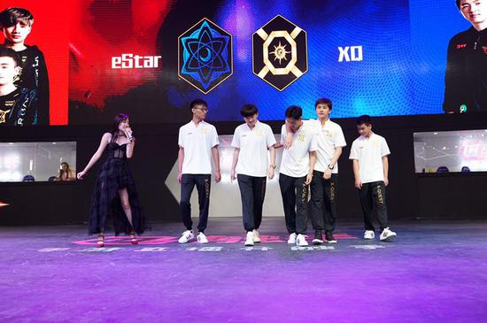 eStar战队登场,出场顺序由高到矮很是整齐,不知是不是此前训练过,不知不觉居然站成了一排手机信号!小渝放言:要拿下阿泰一血,团战可以输,阿泰必须死!