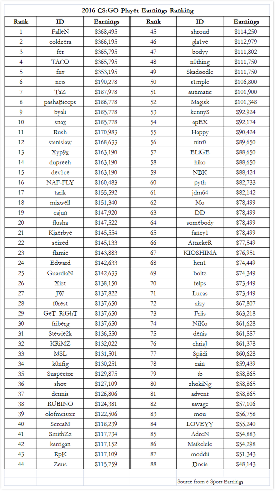 1、2016年CSGO选手奖金排行榜(5万以上)
