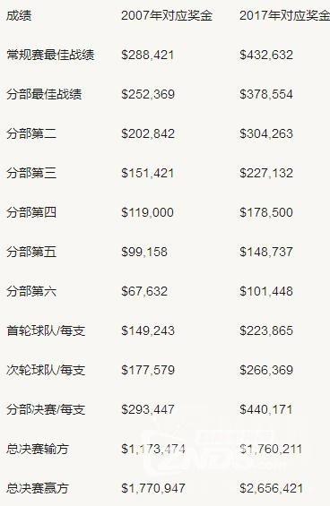 上图可知2017年,只要打进季后赛,最烂的球队都能拿到223,865美元,即占NBA总奖金1500万的1.5%。