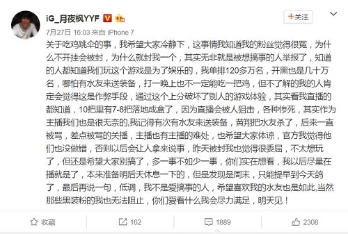 绝地求生火遍电竞圈已是不争的事实,伴随的外挂问题也困扰这个主播们。近日,前职业选手YYF的一则微博引起了玩家们的关注。最近沉迷吃鸡的他被官方封号了,为了回应质疑,YYF也不得发微博说明。