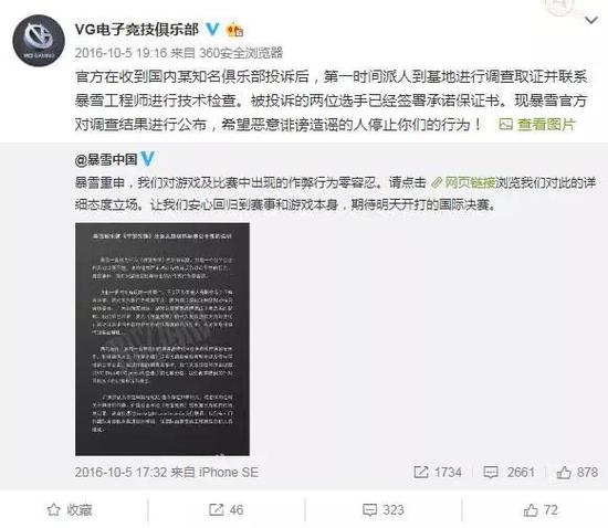 在经过几天的发酵之后,VG战队邀请暴雪去基地检测diya是否真的使用第三方软件,在经过实地检测之后,暴雪并未发现diya开挂的实际证据,于是diya照常参加比赛,但是在之后相当长的一段时间里都背负着骂名。