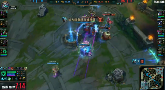 到了中期OMG围绕下路开始尝试让女警推掉下路的一血塔。不过IM也没准备放塔一直来反蹲,双方一度僵持。不过僵持中IM一波失误越塔被OMG找到机会完成2换3后连续拿掉两个防御塔。