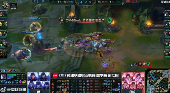 拥有女警的OMG稳扎稳打,一点一点磨掉IM的外塔和野区的资源,大龙逼团,IM防守发现无法击杀女警,只能被杀多人后丢掉大龙。OMG利用大龙Buff破掉所有外塔后经济领先到近10000。