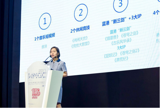 蓝港互动总裁廖明香在大会上发表了题为《双引擎驱动泛娱乐 蓝港互动的IP Maker进阶之路》的演讲,介绍了蓝港互动在泛娱乐布局上的新策略、新阶段,并提出了今年的四个小目标。