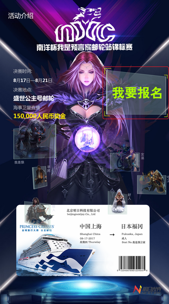 报名二维码通过参加我是预言家天梯赛T1赛季、获得Rank榜前10的玩家即获得出线名额,登上全球顶级豪华邮轮盛世公主号,与众多电竞大咖、明星主播一起争夺最终的“狼王”称号!